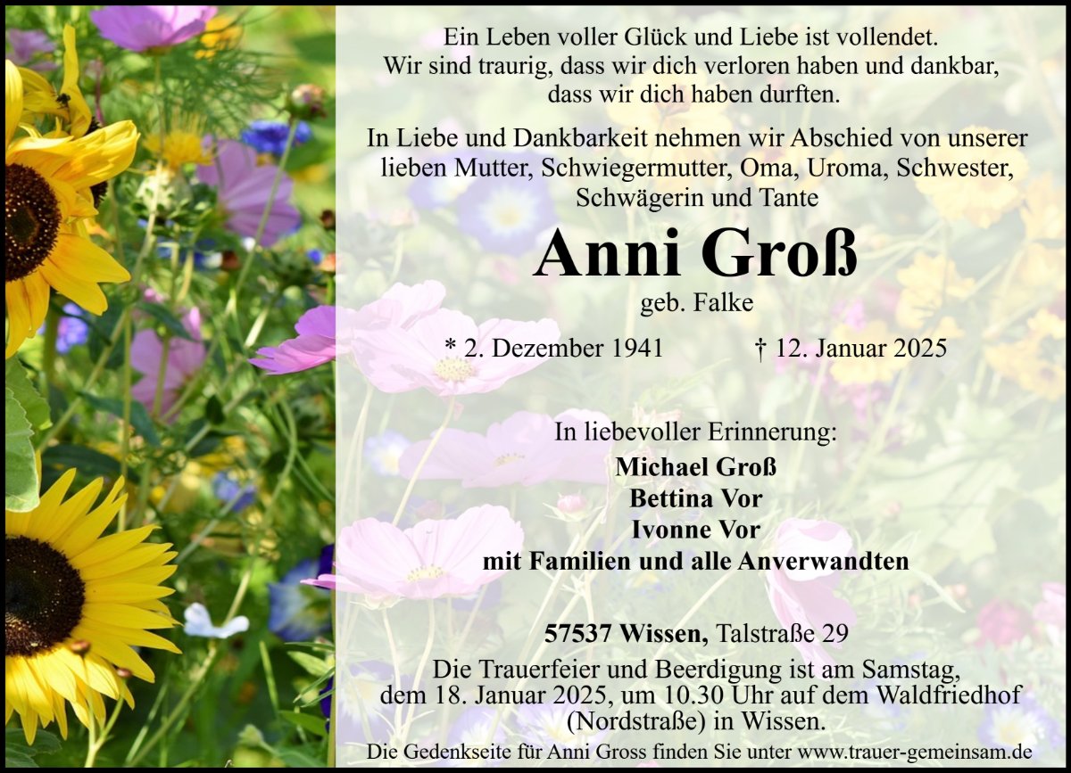 wir wünschen Ihnen für die kommende Zeit viel Kraft und dass es Ihnen gelingt, dankbar auf die positiven Erinnerungen zurückzublicken. Diese Gedenkseite möge Ihnen dabei helfen, Ihre Trauer zu teilen und das Andenken gemeinsam wachzuhalten.