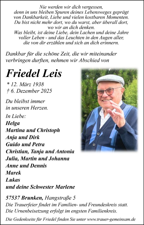 in dieser Zeit des Schmerzes wünschen wir Ihnen Kraft, den Verlust im Kreise Ihrer Liebsten zu verarbeiten. Als Zeichen unserer Anteilnahme und des Gedenkens entzünden wir dieses erste Licht. Möge diese Gedenkseite Ihnen helfen, Erinnerungen zu teilen und so das Andenken gemeinsam wachzuhalten.