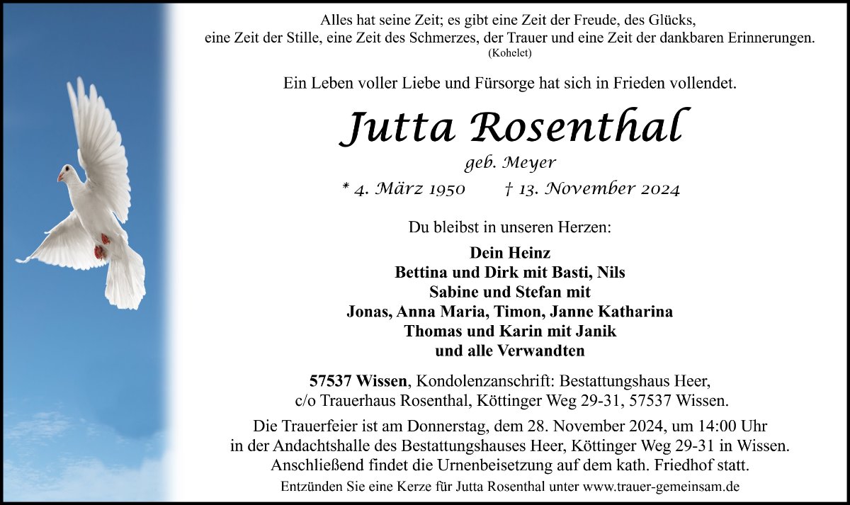 Trotzdem ist es wunderbar ihn gehabt zu haben, dankbar sein für dieZeit, die man gemeinsam verbringen durfte. Jutta ist trotzdem weiter bei uns, denn in den Herzen derer, die sie geliebt oder auch nur gekannt haben, lebt sie weiter. Dort hat sie Spuren hinterlassen durch ihre liebenswerte Art.