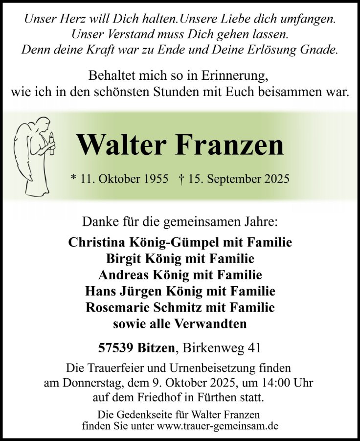 wir wünschen Ihnen für die kommende Zeit viel Kraft und dass es Ihnen gelingt, dankbar auf die positiven Erinnerungen zurückzublicken. Diese Gedenkseite möge Ihnen dabei helfen, Ihre Trauer zu teilen und das Andenken gemeinsam wachzuhalten.